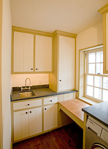 Laundry room cabinetry. Note the beaded board and batten doors and the soapstone countertop.